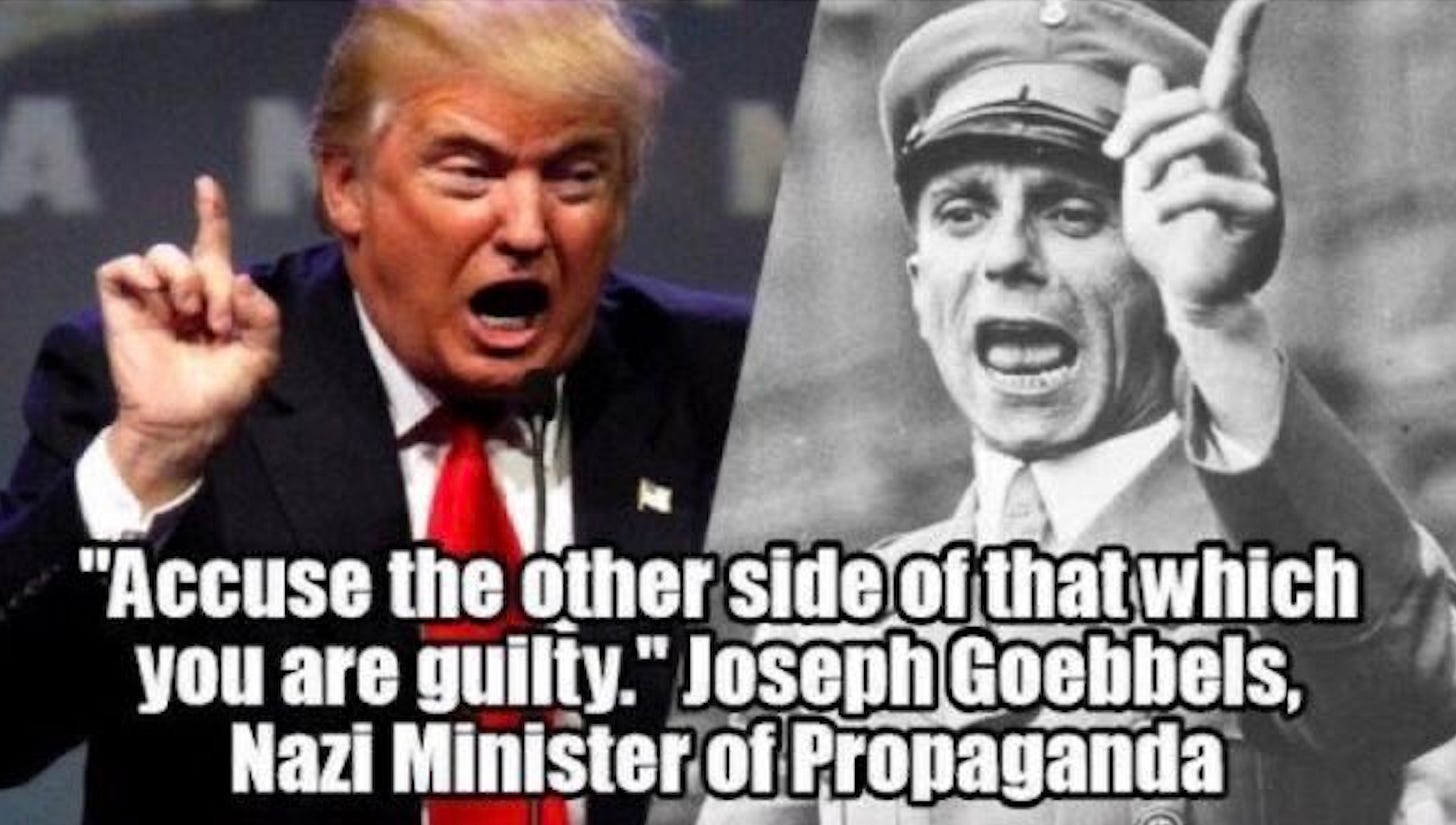 On the other hand, malignant narcissists like trump are almost always unconsciously projecting their faults and dirty deeds because they cannot mentally handle their own truths, thus must blame everyone else for their problems. What a strange coincidence that both nazis and narcissists use scapegoats to justify their dark, abusive and horrific behaviors.