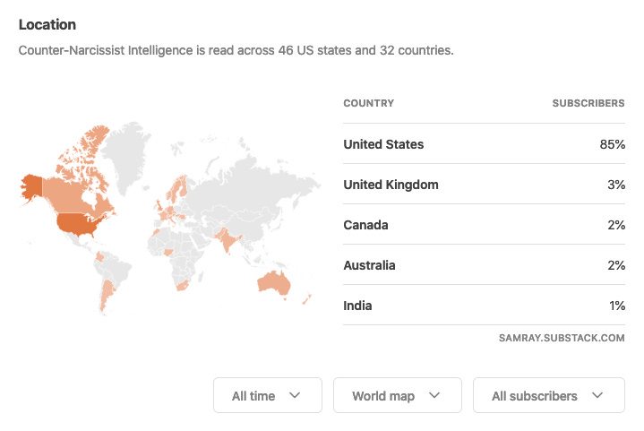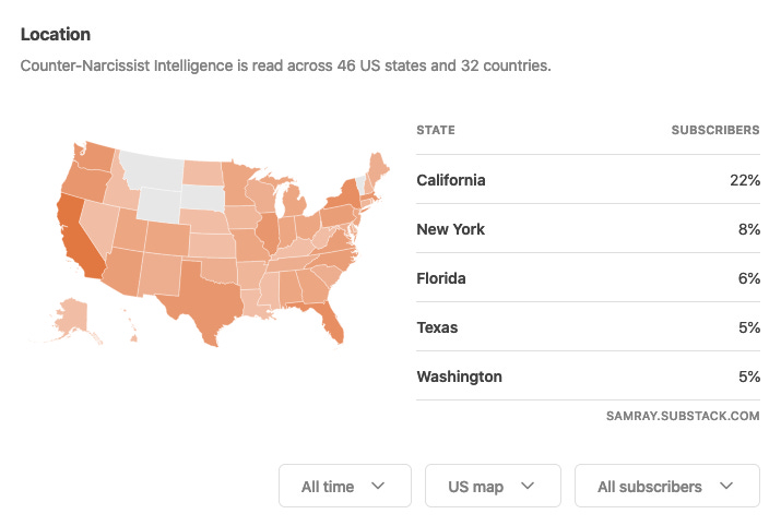 That is why I am also very happy to report that from an internal perspective, this deep, fun and wild ride in building a community has mostly gone a fair amount better than expected. Of course it is all relative but coming up on 600 subscribers in six months has definitely exceeded expectations. I have always known most people need some Counter-Narcissist Intelligence, because almost every one of us has to deal with at least one or more malignant narcissists sooner or later.