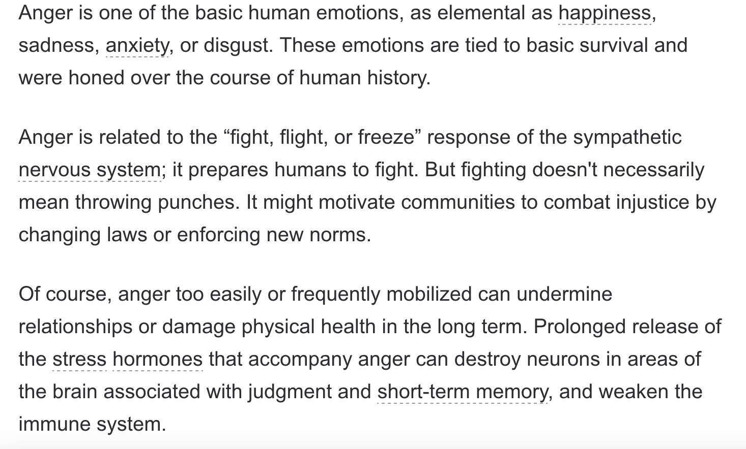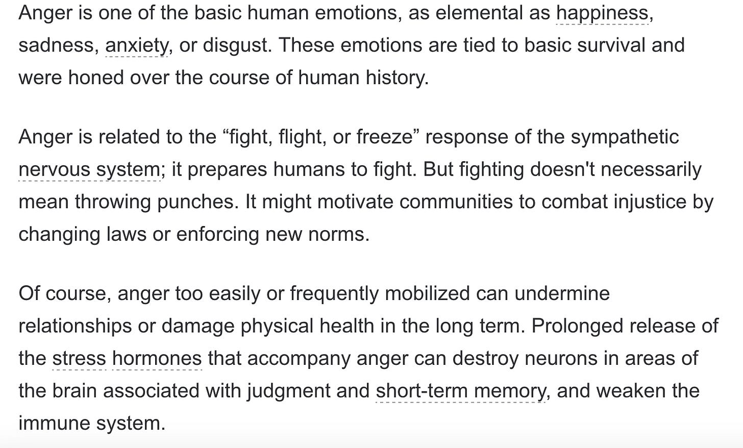 The fact that “prolonged release of the stress hormones that accompany anger can destroy neurons in areas of the brain associated with judgment and short-term memory and weaken the immune system” makes perfect sense and explains a lot.