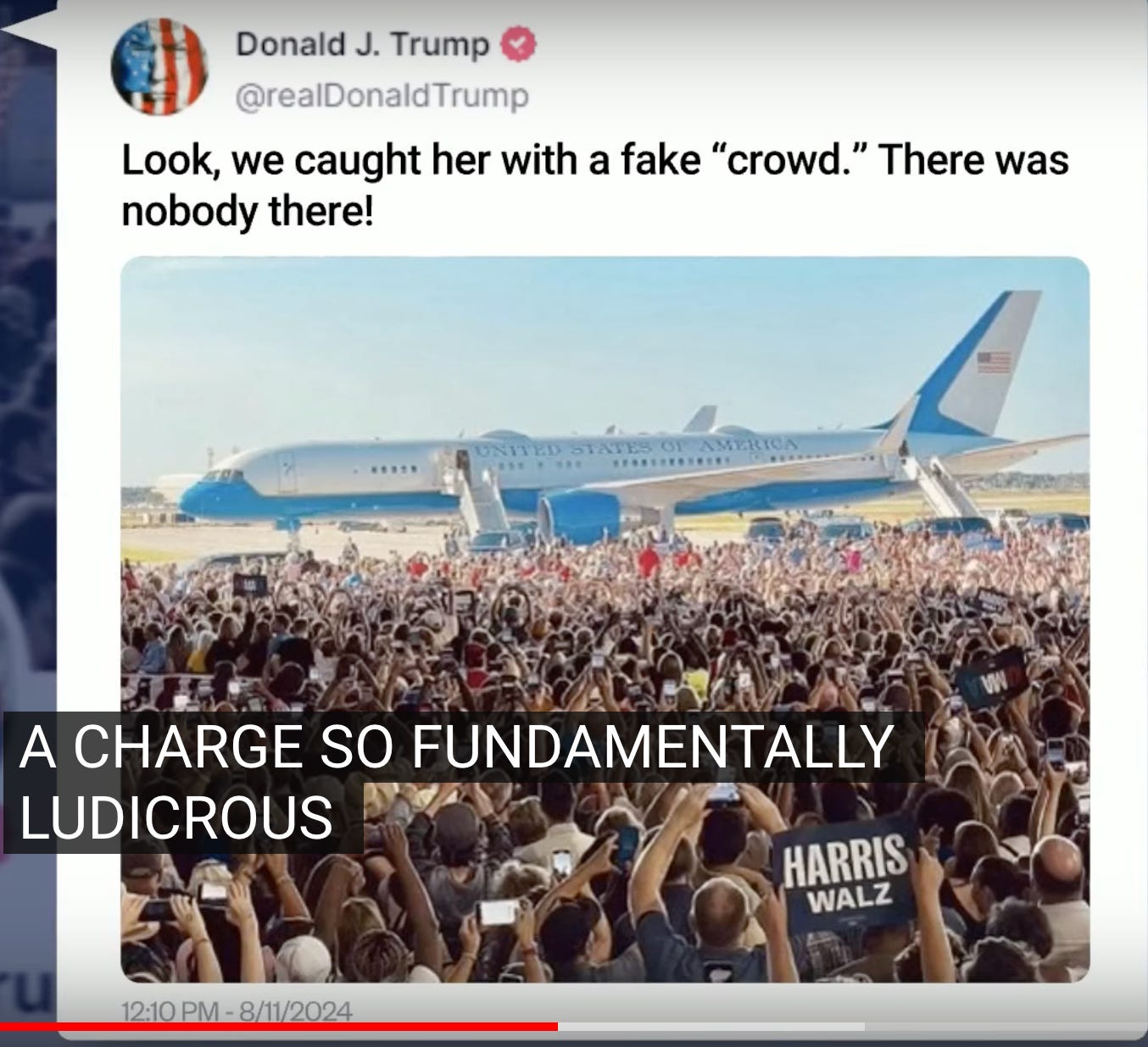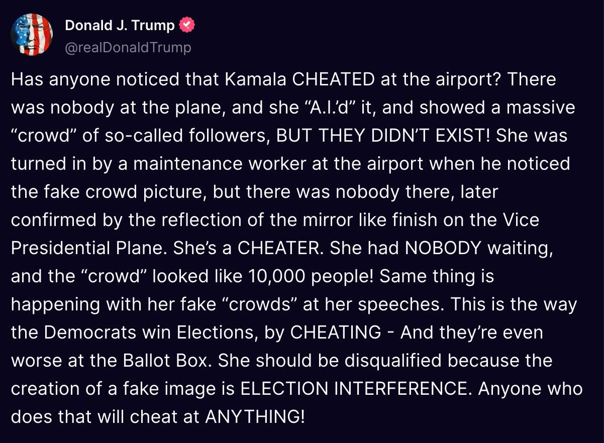 Certainly as per his tweets, trump had previously revealed to Team Kamala how insecure her crowd sizes made him when he started claiming her very enthusiastic events were nothing but AI generated, which was almost as big and obvious of a lie as trump claiming everyone in America wanted a “woman’s right to choose” overturned, when it wasn’t even close to a majority who wanted to take away women’s rights.