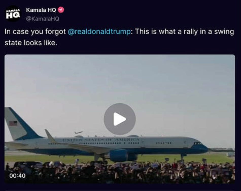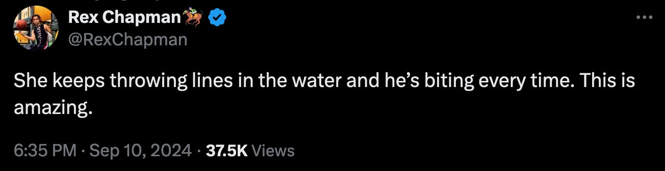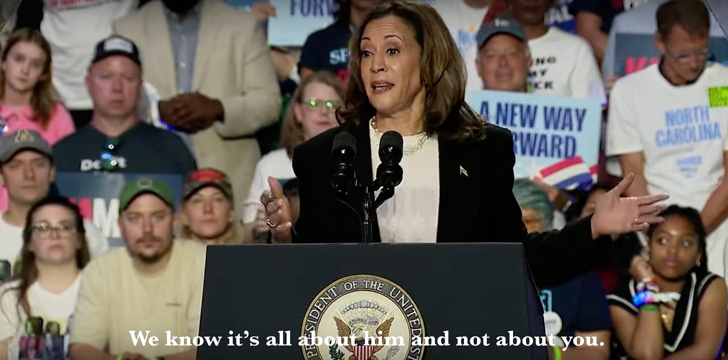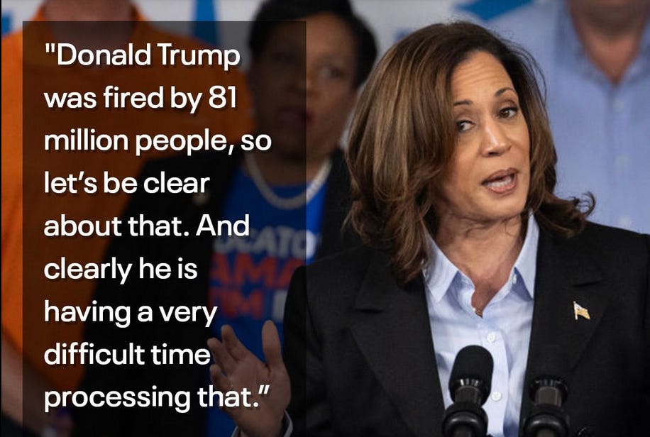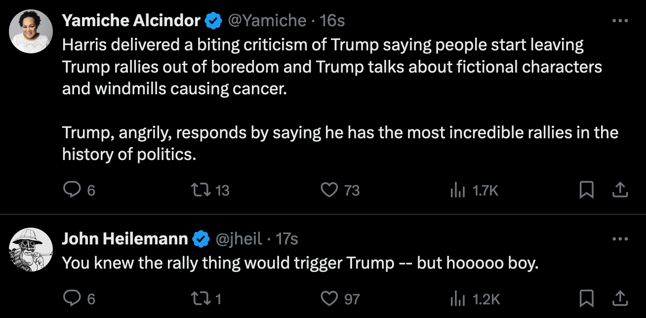 The other main jugular Dark Kamala effectively sliced and diced was his fragility over his crowd sizes, and how maga folks are now getting bored and leaving his rallies early. These are certainly truths that trump was never going to be able to psychologically handle or process, which is of course why he loses his mind when he is reminded of it.