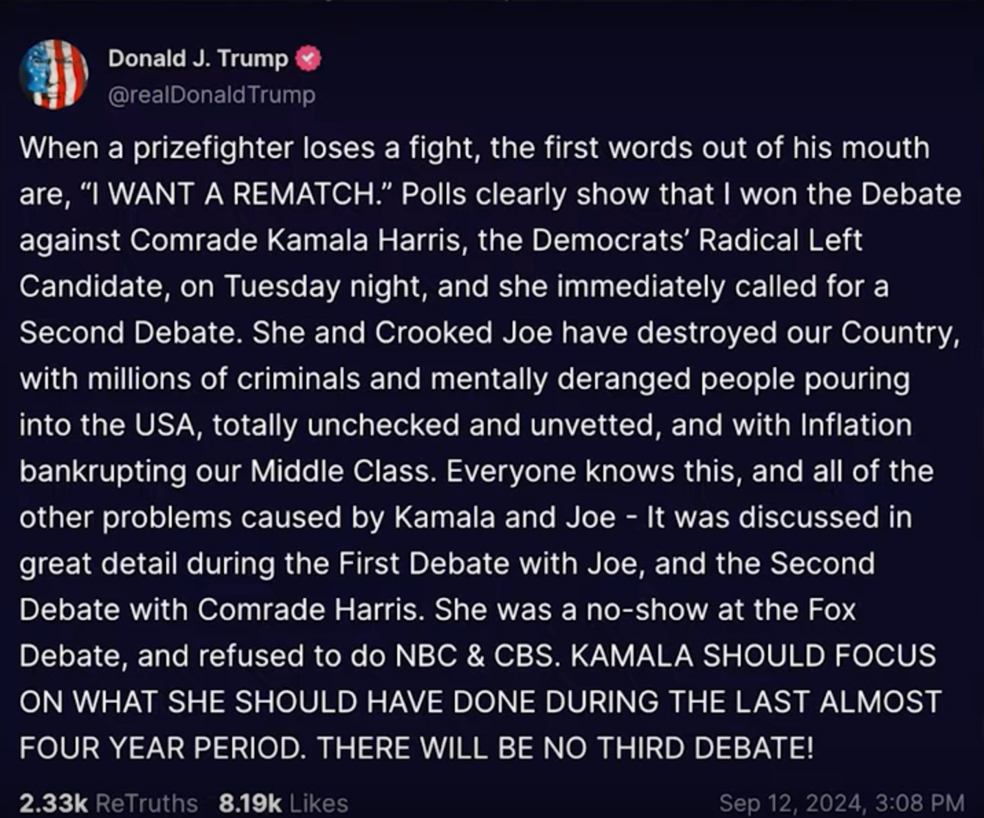 Of course the feckless fact-less trump is still whining about how being fact-checked was unfair to him, and says Kamala not being checked meant the debate was rigged against him. As most point out, she didn’t need to be because she wasn’t lying throughout the debate.